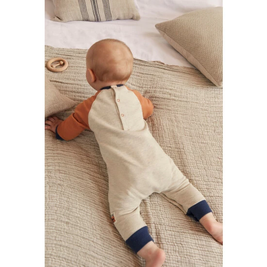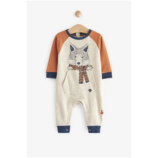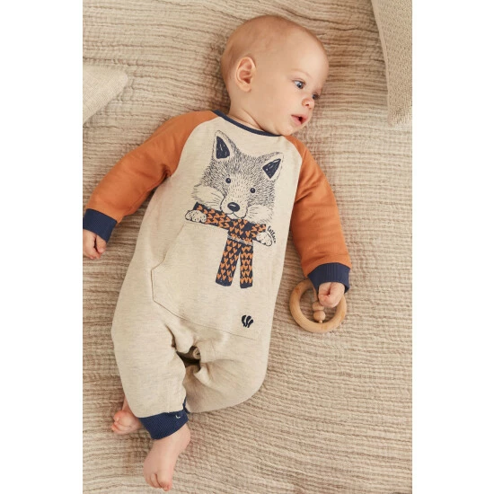 A supersoft cotton jersey romper from FatFace. Designed with a fox theme, this rompersuit has a fox graphic at the chest. With raglan sleeves and a contrast tipped neck and ankle cuffs, it has a front pouch pocket and poppers at the back and legs for easy dressing. A FatFace woven branded tab is sewn at the seam.
