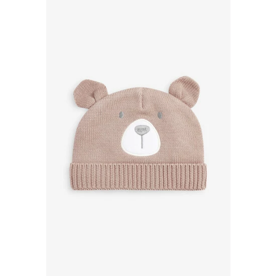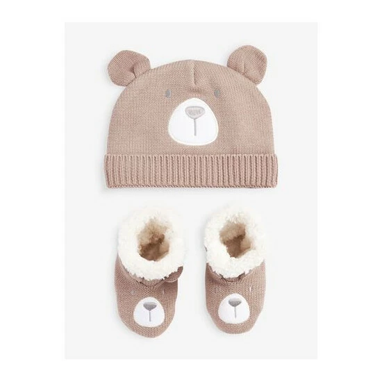 A supersoft cotton knit hat and boots set from FatFace. With a comfy turn-up rib brim and bear face and ears on the hat. The matching boots are fleece lined with cheeky 3D faces and gripper paw pads on the soles.