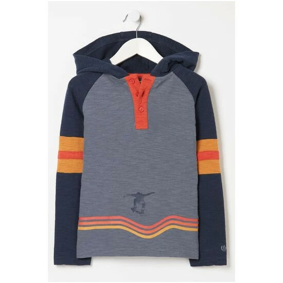 This hooded t-shirt is the perfect layer as the temperature drops. Crafted with love from 100% supersoft and comfortable cotton, it features a cool skater graphic, long sleeves, button up chest for easy dressing, and colourful stripes. Wear it alone with jeans and trainers, or layer over a tee on chilly days.