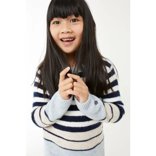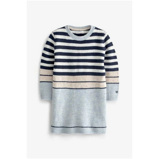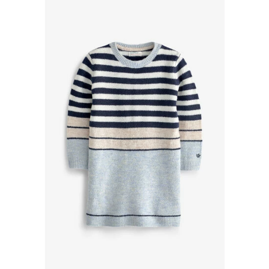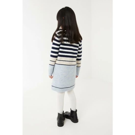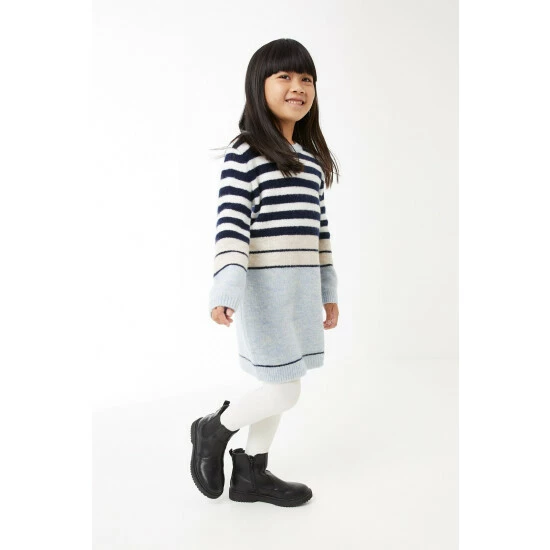 This knitted dress isn’t just stylish it features a touch of wool and stretch in the fabric for extra comfort and warmth. It has ribbed detailing and a cute stripe design for a fun finishing touch.