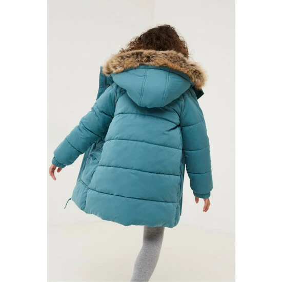 Keep your special little lady warm with our super comfy, shower resistant coat, that s built to last. In a longline design, it features handy side pockets, cosy lining and floral interior, zip through and button up fastening, and a generous hood with a detachable faux fur trim. Whether she wants to play in the back garden or at your nearest park, she will be safe from the chillier evenings and enjoy being in the great outdoors for longer. There s also a hand-me-down label inside our coats, so that when your little one has outgrown theirs, they can pass it on to someone else to love.