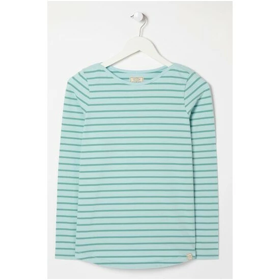 A staple style with an elevated finish, this green t-shirt from FatFace is crafted in a soft cotton blend. With a high neckline and long sleeves, it features a classic Breton print and scooped hemline.
