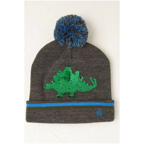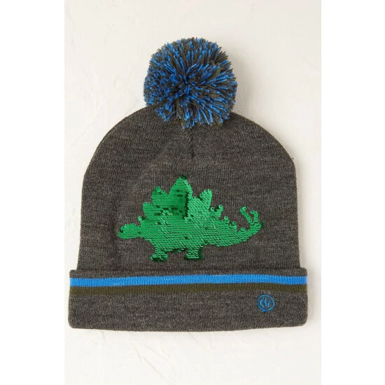 A roarsome hat for the dino lovers in your life. Grey dino beanie hat with reversible sequins and large pom.