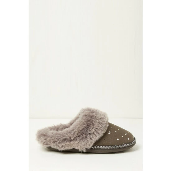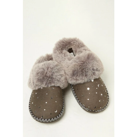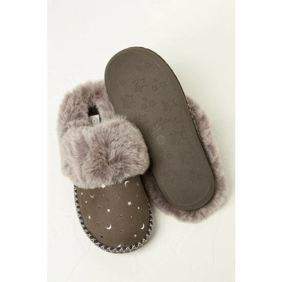 Supersoft, comfortable and with a cute faux fur trim and star print, these mule slippers are perfect for all your cosy evenings and lazy days. They have rubber soles for grip and are finished beautifully with contrast stitch detailing.