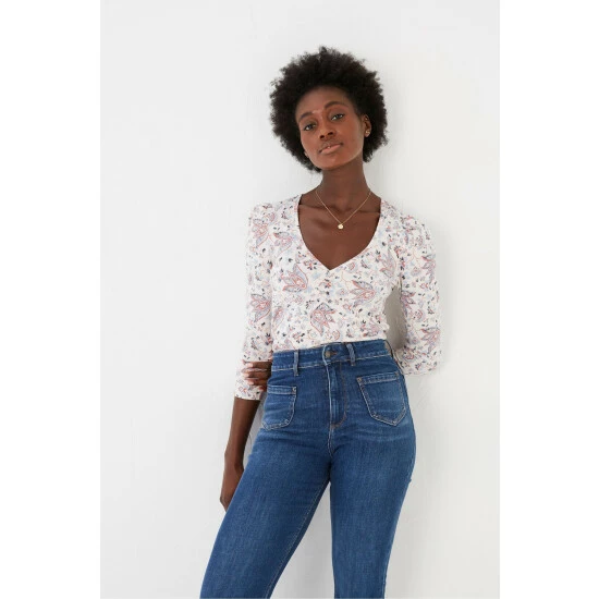 Flatter your figure in this beautiful floral top. Featuring a stunning open V neckline, supersoft material and 3/4 sleeves for a dressed up look. Pair it with jeans and boots for a daytime look, or try it with heels if you’re heading out after dark.
