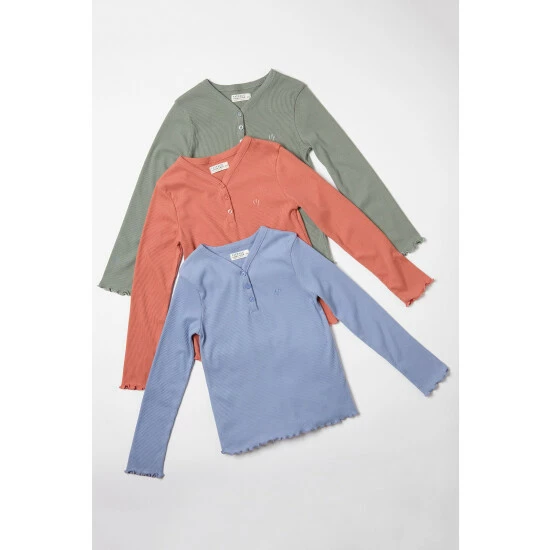 Stock up on the essentials for the little ones with this handy pack of three Henley long sleeve t-shirts. They’re made from soft fabrics and come in a great fit, so they can stay comfortable all day. They’re the perfect layering piece, all finished off with a pretty frill hem and cuffs, button-up neckline and embroidered logo for a touch of detail.