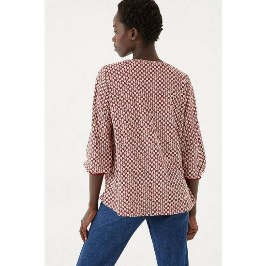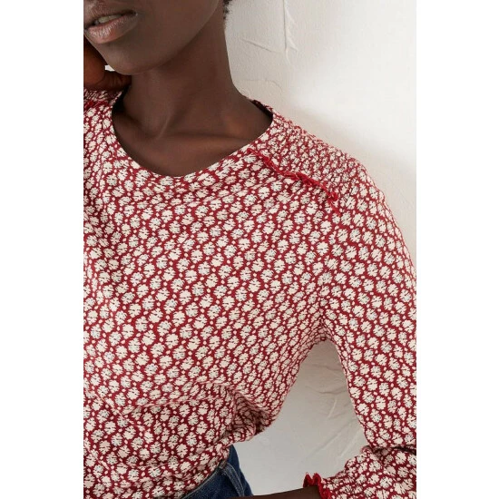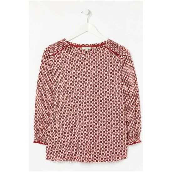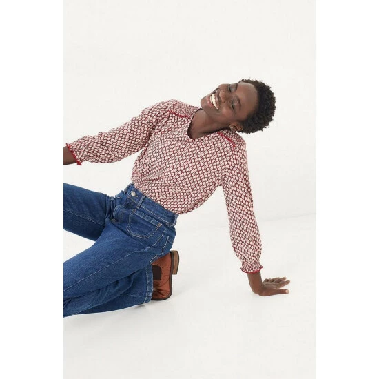 Add some colour to your wardrobe with our Darcy Geo Top. Crafted with a cotton and modal blend for a long lasting comfortable fit. Featuring a longer sleeves with fitted cuffs which are finished with frills and a rounded neckline. Try styling with a darker pair of jeans for a contrasting look.